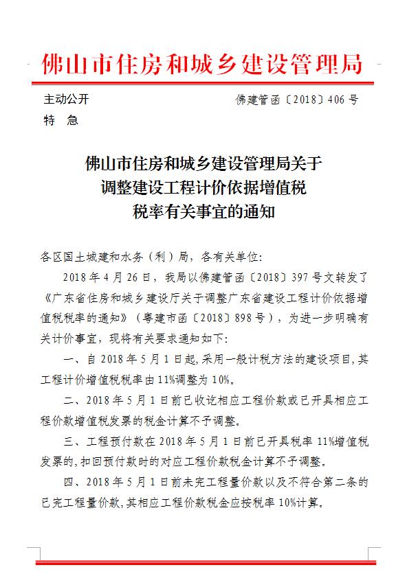 佛山市住房和城乡建设管理局关于调整建设工程计价依据增值税税率有关事宜的通知