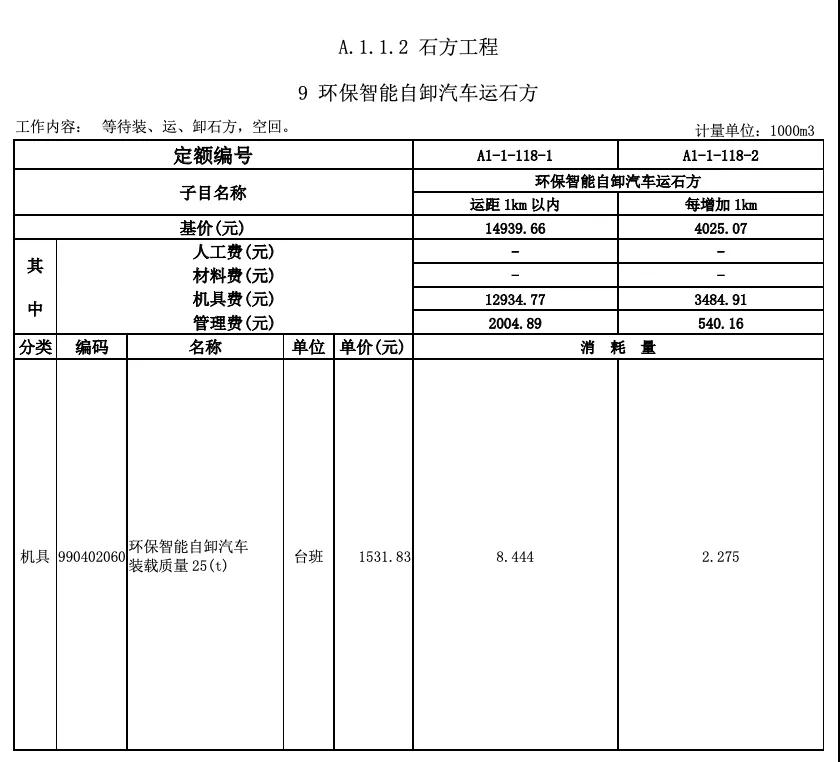 2.本补充定额子目已包括了环保智能自卸汽车等待装、运、卸土方、淤泥流砂、石方以及空车回程等的台班消耗量,不包括弃土场消纳处置费。