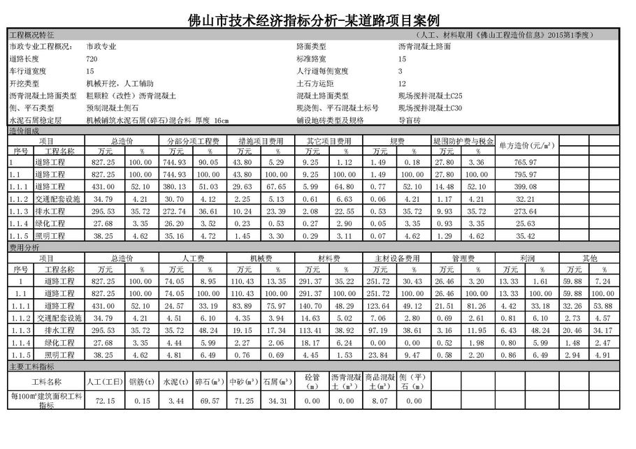 佛山市2015年第2季度技术经济指标分析—某道路项目案例